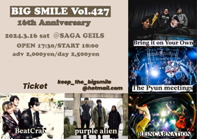 | 3/16(土) | Bring it on Your Own(長崎) The Pyun meetings BeatCrab REiNCARNATiON purple alien ![]() |